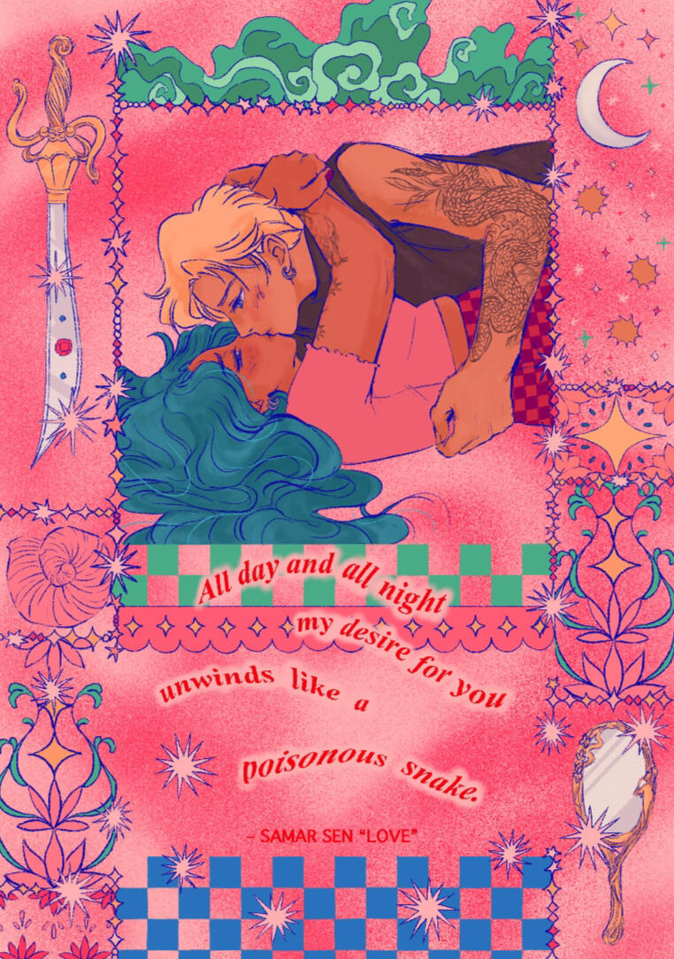 $360 : 2 figure bust ($180) + ornate border ($150) + extra prop sword ($20) + extra prop mirror ($20) + text design (Free) + simple abstract background - artist choice (Free) + extra body discount (-$10) = $360
